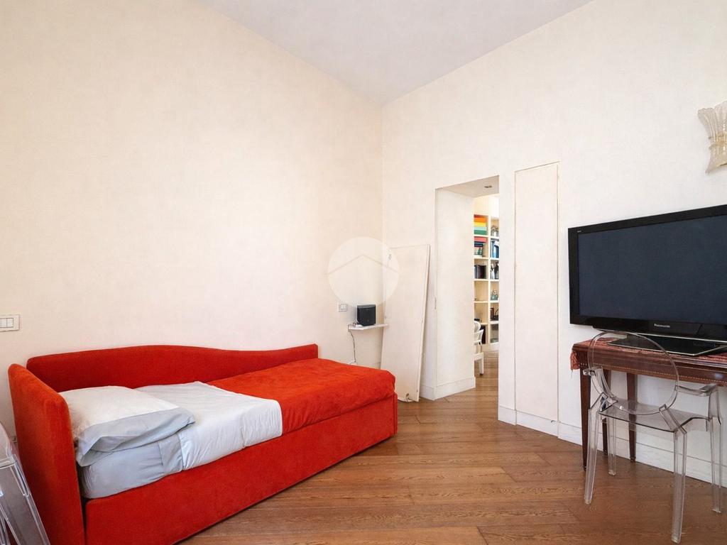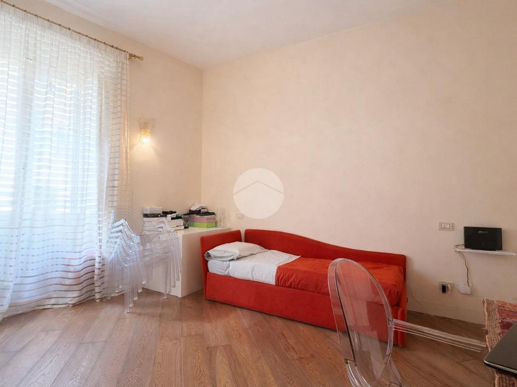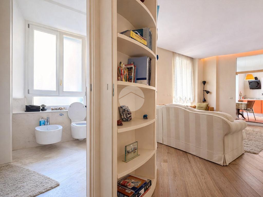 Particolarità di questa è la porta scorrevole semicircolare che riprende lo stesso design della libreria e che permette di separare i due ambienti per avere ciascuno una propria indipendenza.
