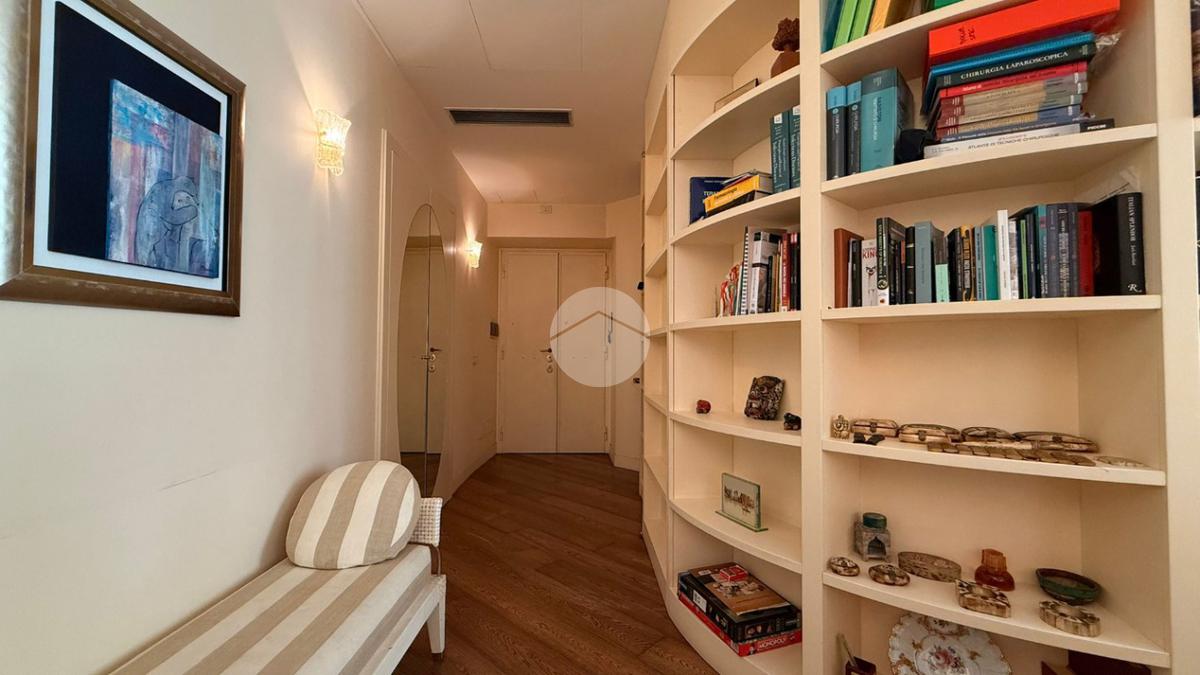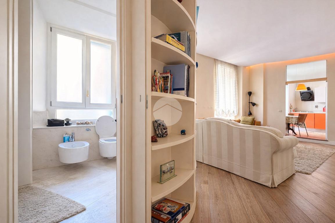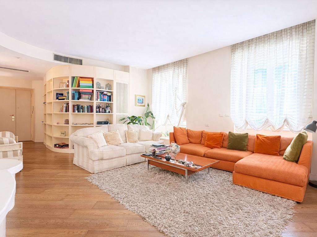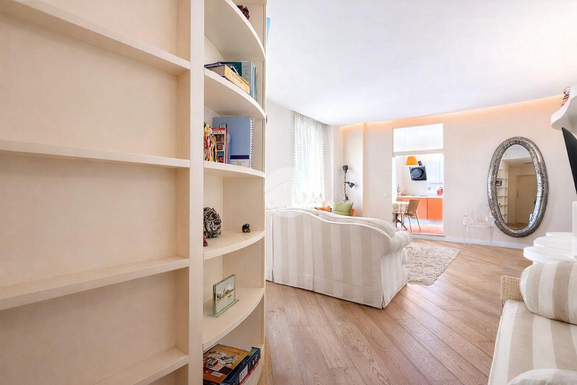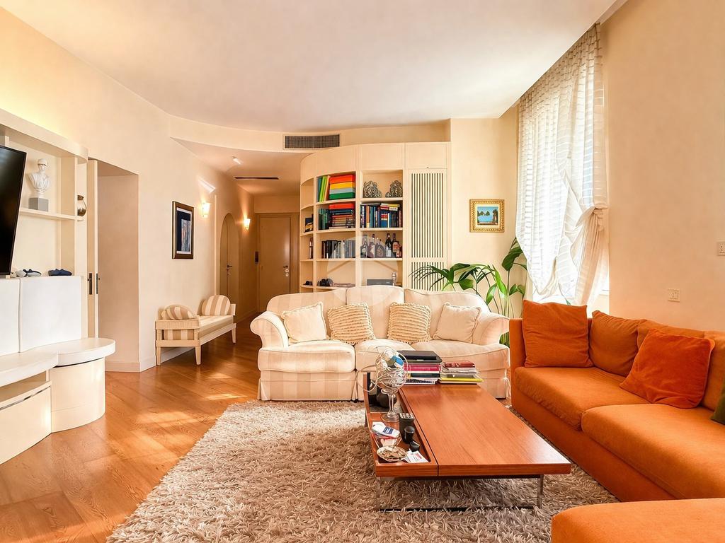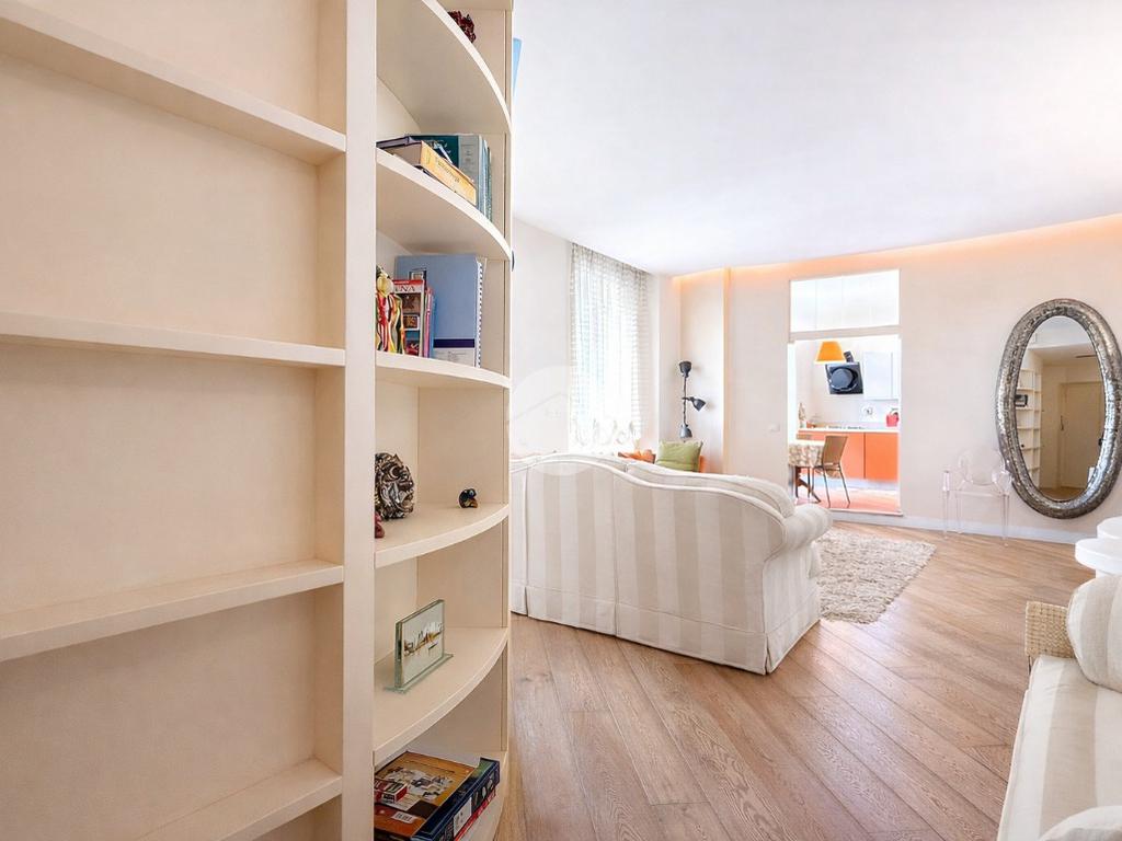 Proseguendo abbiamo un ampio soggiorno vivibile, caratterizzato da una doppia finestra che garantisce una buona luminosità durante tutta la mattina e primo pomeriggio. Una particolarità del soggiorno è la libreria che segue una forma semicircolare, che “nasconde”il principale servizio finestrato, completo di sanitari e con doccia.